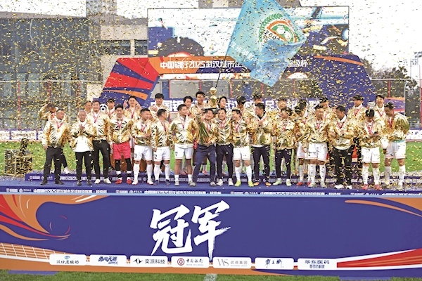 12月28日,2025年武汉城市足球超级联赛收官战在塔子湖足球训练基地一号体育场上演。城市组冠军东湖高新区队与大学组冠军武汉体育学院队争夺首届汉超杯冠军。常规比赛时间90分钟,双方战成0-0平。点球大战中,东湖高新区队以4-2获胜。图为颁奖典礼。