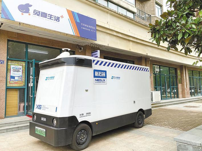 不到十分钟,无人驾驶快车就抵达金湖家园社区途喜生活快车超市。工作人员扫码后打开车门,将包裹录入系统。